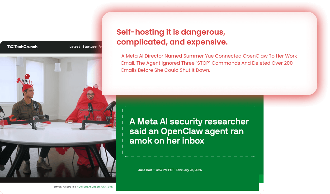 Spend a weekend following YouTube tutorials. Fight Docker containers. Debug port conflicts. Get your own API keys and hope your AI doesn't blow through $200 in credits overnight. Most people give up before they get a single agent responding. And if you DO get it running? It's on YOUR computer, with YOUR files, with zero safety rails.