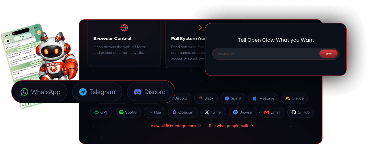 Talk to your OpenClaw through apps you already use. No special software. No dashboards required for basic tasks. Just message it and it works.