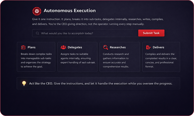 Give it one instruction. It plans, breaks it into sub-tasks, delegates internally, researches, writes, compiles, and delivers. You're the CEO giving direction, not the operator running every step manually.