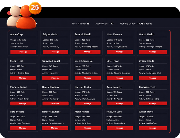 Each client gets their own isolated AI team. Their data, their configurations, their outputs. Completely separate from every other client and from your own setup. Manage all 25 from one clean dashboard. See activity, usage, and status at a glance. Scale from 1 client to 25 without ever feeling overwhelmed.
