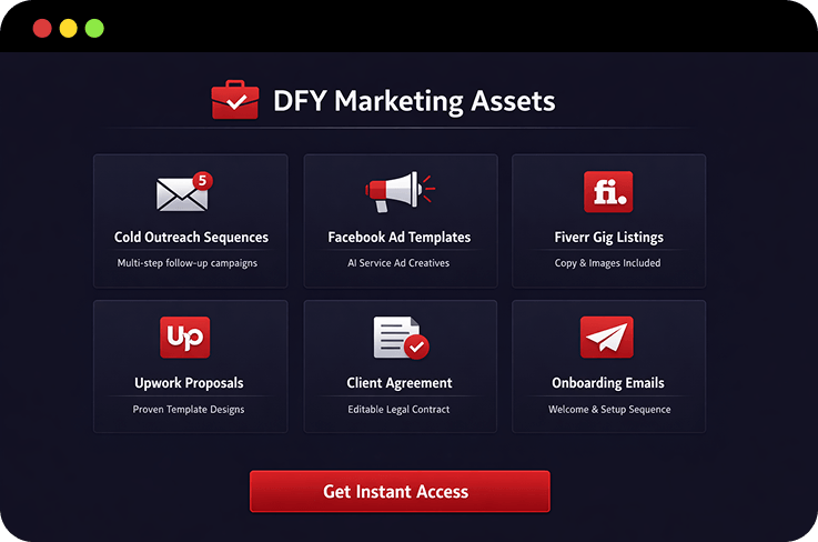 5 cold outreach sequences (multi-step follow-up campaigns for different industries). 3 Facebook ad templates (targeting local businesses with AI service messaging). 5 Fiverr gig listings (copy and images, ready to publish). 3 Upwork proposal templates (tested and proven conversion rates). Client service agreement template (editable legal contract). Onboarding email sequence (welcome, setup instructions, first deliverable expectations).