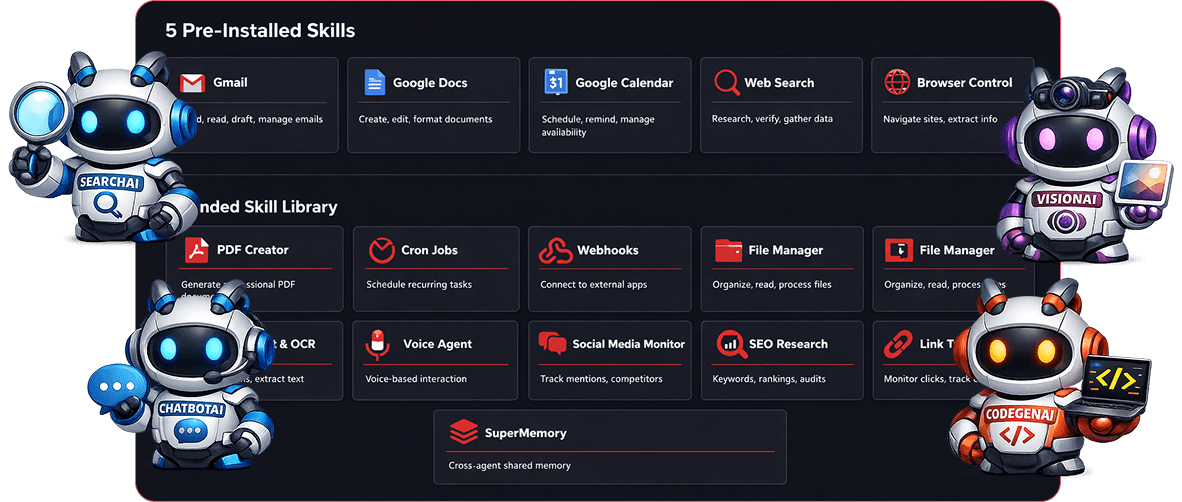 Browser Control, SuperMemory, Real-Time Web Search, Gmail Integration, Google Calendar, Google Docs/Sheets, File Manager, Screenshot & OCR, Cron Jobs (set-and-forget scheduling), Webhook Receiver (Zapier/Make/n8n), Voice Agent, Social Media Monitor, SEO Research, PDF Creator, Link Tracker. All configured. All working. Zero setup on your part.