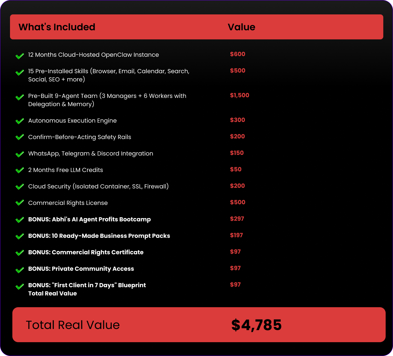 P.S. $4,785 in real value for $37. That's not a typo and it's not a gimmick. 12 months hosting, every skill pre-installed, a full agent team, cloud security, 2 months free LLM credits, commercial rights, Abhi's AI Agent Profits Bootcamp, and 4 more bonuses. All one-time. Everyone else charges monthly for a blank install. You're getting the complete loaded system.